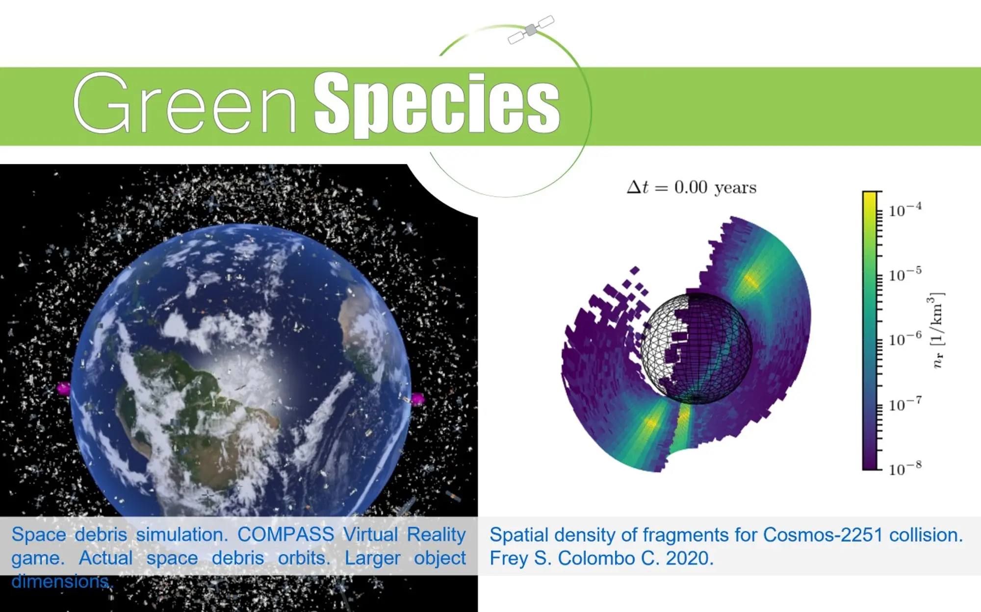 Space assets offer services of social and economic benefit for the humankind and enable monitoring the condition of our planet. As recognised by the UN and space agencies, space missions for Earth observation, geolocation, telecommunication, science, and technology contribute to the achievement of the Sustainable Development Goals. As our lives become more and more interconnected thanks to satellites and space is more easily accessible, Space can be seen as the extension of our planet biosphere. As such, long-term sustainability of space activities will be possible only if a change of behaviour is put in place by space faring nations. The growth of space debris is following an exponential trend, which is typical of many other environmental stressors of Earth system trends. Immediate actions are needed to mitigate the increasing risk of collisions and enable the future use of Space as a common. In GREEN SPECIES project I will devise a new interdisciplinary framework for the modelling of the space debris population, and the forecast of its evolution. A probabilistic space debris model will be devised for the overall space debris environment. All uncertainties of physical, economic, and political nature will be modelled, and the forecast of future launch traffic and compliance to guidelines included via economic approaches and evidence theory. As unique feature, the project will incorporate the management of the debris environment through a robust time-delayed controller, applied to the space debris model, described as a complex dynamical system. Ideal feedback control actions will be transformed into policies and guidelines, via quantitative indicators, assessing both the environmental impact and the social and economic benefit of space missions. Policies will act as the actuator of a real controlled system. GREEN SPECIES will propose the first economic model for a revenue system for Sustainable Space by leveraging approaches from the management of the global climate.