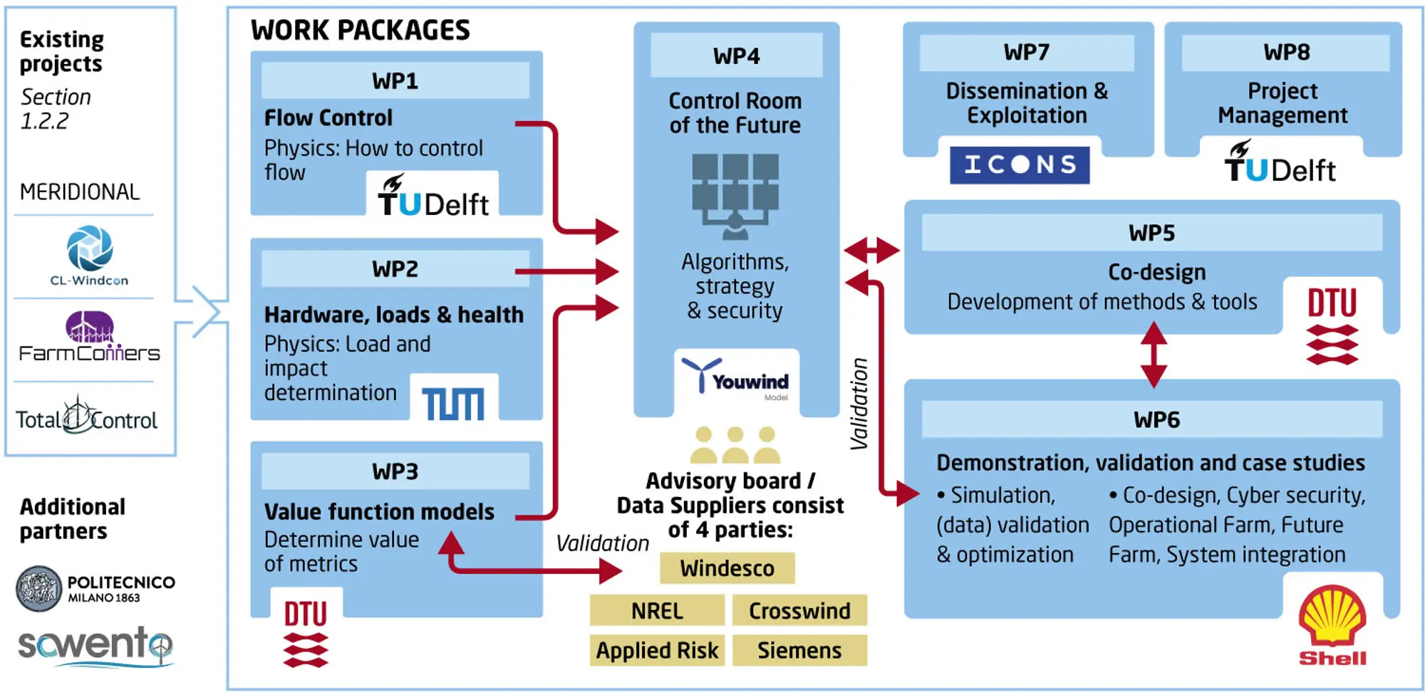 Wind energy is crucial for realizing climate neutrality, energy independence, and energy security. With the increased penetration of renewables in the electricity grid, there is a strong need for control technology to determine the number of electrons to produce and their destination (e.g., grid, storage, hydrogen) for maximum value to the energy system. Whereas the technology available on the market exclusively maximizes the energy yield, the future lies with optimization for cost of valued energy (COVE), which considers energy security, storage, fluctuating electricity prices, turbine component wear, and turbine lifetime. Therefore, SUDOCO will develop open-source technology for resilient, and data-enabled offshore wind farm control and co-design. We will use key aspects and insights in wind farm operation to develop the Control Room of the Future that will allow operators to control wind farm output and loads by minimizing the COVE. SUDOCO will combine novel dynamic control algorithms, hybrid physics-based and data-driven models for the design of physical farms considering their governing control laws, which are safeguarded against adversarial threats and third-party fraud. Our data driven integrated control tool chain will be trained, validated and optimized using several high-fidelity datasets. These include data from full-scale dedicated wake steering control experiments performed at the 69 11-MW turbines in the Hollandse Kust Noord wind farm. We will also perform unprecedented wind farm control experiments with scaled wind turbine models in the largest boundary layer wind tunnel in Europe. SUDOCO will target a COVE reduction of 10%, and includes means to minimize environmental impact as well as address the variability of the wind resource. SUDOCO will deliver the first intelligent integrated wind farm control and design solution for reliable, safe, and cost- effective operation of large bottom-fixed and floating offshore wind farms.